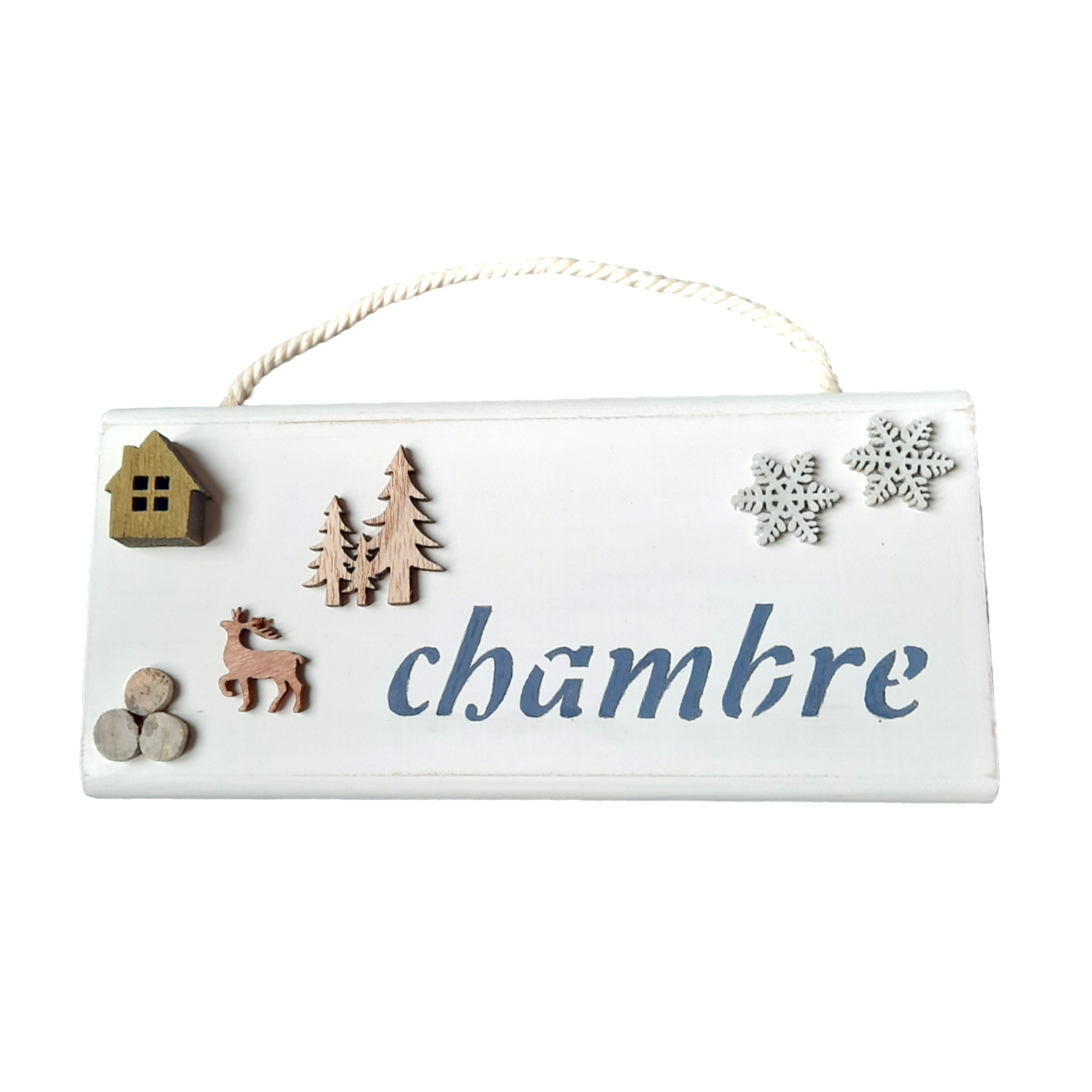 Plaque de porte chambre en bois peint, coloris blanc cassé.